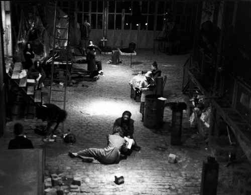 Die Bühne ist ein kalter, schmutziger Hof vor einem verschlossenen